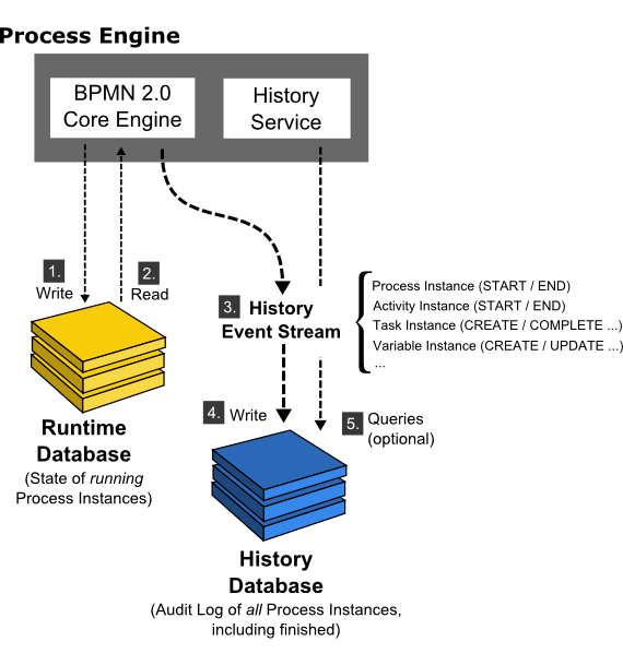 The process engine maintains the state of running process instances inside the database. This includes writing (1.) the state of a process instance to the database as it reaches a wait state and reading (2.) the state as process execution continues. We call this database the runtime database. In addition to maintaining the runtime state, the process engine creates an audit log providing audit information about executed process instances. We call this event stream the history event stream (3.). The individual events which make up this event stream are called History Events and contain data about executed process instances, activity instances, changed process variables and so forth. In the default configuration, the process engine will simply write (4.) this event stream to the history database. The HistoryService