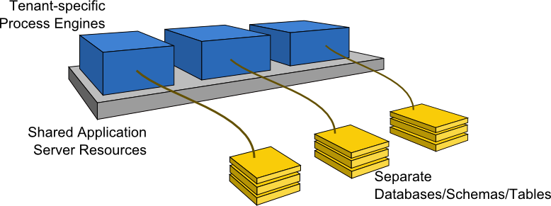 Multi-Tenancy can be achieved in two different ways. One way is to use one process engine per tenant. The other way is to use just one process engine and associate the data with tenant identifiers. The two ways differ from each other in the level of data isolation, the effort of maintenance and the scalability. A combination of both ways is also possible.