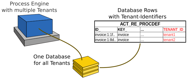 Multi-Tenancy can be achieved with one process engine which uses tenant identifiers (i.e., tenant-ids). The data of all tenants is stored in one table (same database and schema). Isolation is provided by the means of a tenant identifier that is stored in a column.