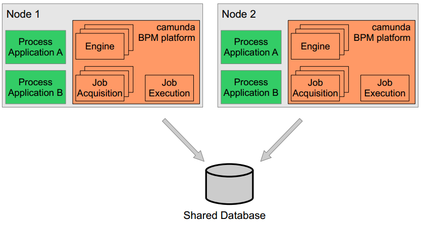 When running CadenzaFlow in a cluster, there is a distinction between homogeneous and heterogeneous setups. We define a cluster as a set of network nodes that all run CadenzaFlow against the same database (at least for one engine on each node). In the homogeneous case, the same process applications (and thus custom classes like JavaDelegates) are deployed to all of the nodes, as depicted below.