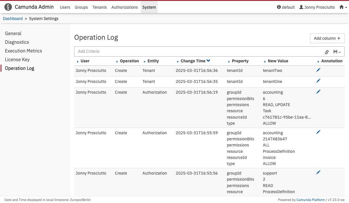 It is often desired to inspect which user performed which operation for auditing purposes. Admin operations are logged in the user operation log that is part of the process engine’s history. The log allows to understand