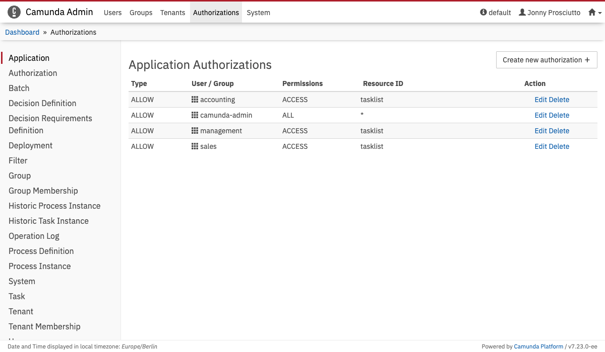 Depending on the users authorization, Tasklist will show you information about your colleagues and groups. Currently you can only see the group folder support but not your colleague. To change that, log in to the admin application as administrator, enter the Users Authorization menu and create the following rules: