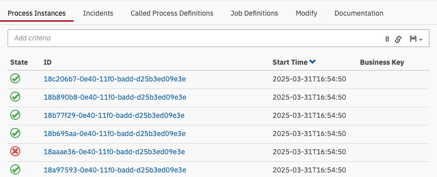 Now we have to get the process instance id from Cockpit. You can find the ids of all running processes after clicking on a process definition name or diagram preview on the Cockpit dashboard.