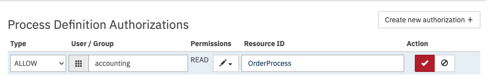 It is possible to restrict a group’s/user’s permissions to a single process instance, i.e., after the process ends, the group/user will not be able to change any other running process instances. We will use the accounting group again in this example. We assume that the group has access to Cockpit (also see Application Access) and that a process with the name and key OrderProcess is present.