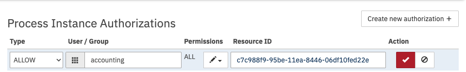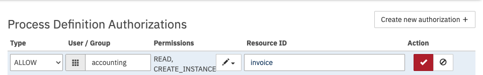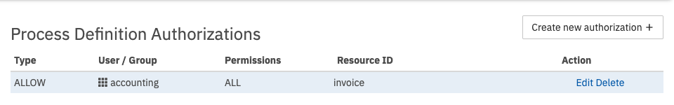 We grant the accounting group all permissions for the invoice process because they shall be able to manage their process completely. The resource id references the key of the process definition.