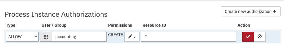 permission is necessary for the group to be able to create new process instances. The resource id references the generated process instance ids, therefore we use the asterisk, because we can’t know the generated id in advance.