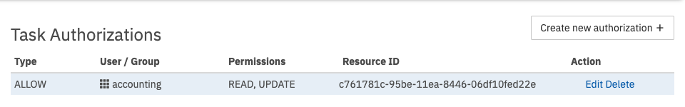 This will automatically create an entry for the task with the task id as resource id in Admin and grant the READ