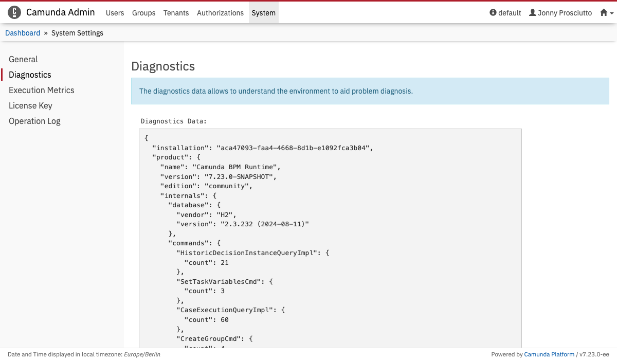 The Diagnostics menu allows you to view and copy diagnostics data about your environment or distribution of CadenzaFlow. The main purpose of the Diagnostics menu is to increase transparency by giving you easy access to important system diagnostics information. In the event of an issue, this should also improve problem diagnosis by enabling you to quickly understand and share the CadenzaFlow environment you are running.