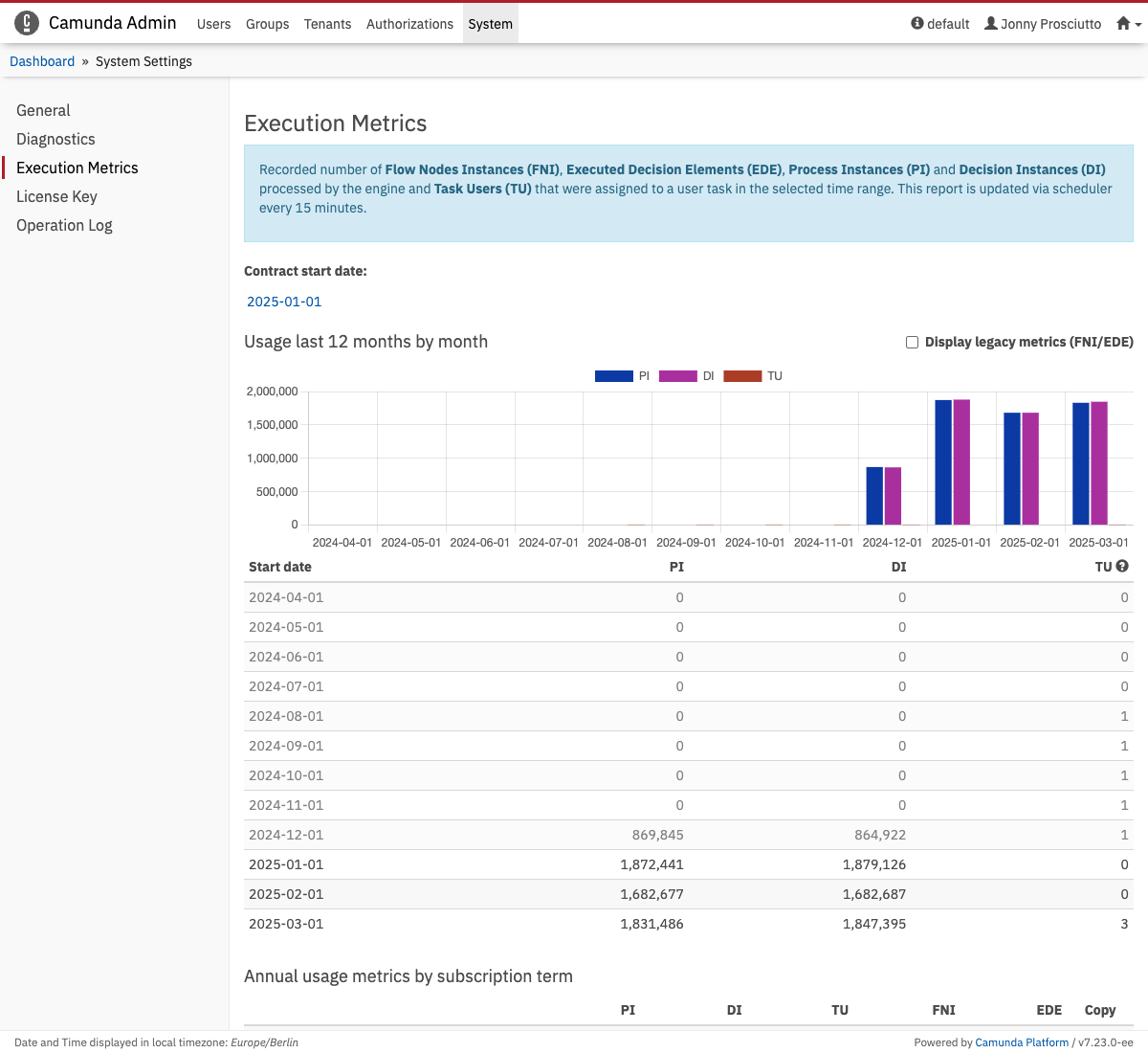 The Execution Metrics menu in Admin displays an approximate number of Flow Nodes Instances (FNI), Executed Decision Elements (EDE), Process Instances (PI) and Decision Instances (DI) processed by the engine and Task Users (TU) that were assigned to a user task by the selected contract start date.