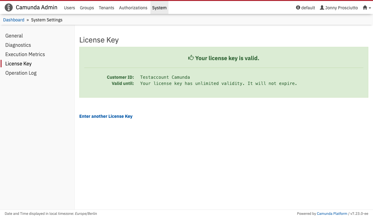 The System Settings menu gives you general information about the process engine. It enables users with system permissions to access certain system information, including diagnostics, metrics, and license key. Provided that you are using the Enterprise Edition of CadenzaFlow, you can also insert your License Key.