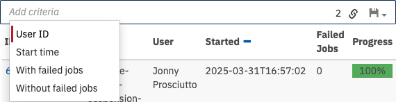 Above the in progress batches table, you can search for batches which fulfill certain search criteria. To do so, click in the search box and select the parameters to search for. You can also begin typing to find the required parameter faster. Depending on the selected property, you have to specify the value of the property. You can combine multiple search pills to narrow down the search results.
