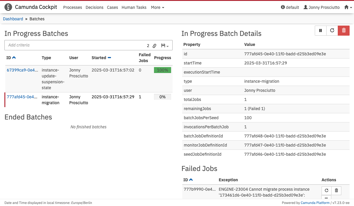 For batches that are currently in progress, the ID, type, user, started time, number of failed jobs as well as the progress is displayed. Please note that if a batch has failed jobs, the batch cannot be completed. You have to go to the details view of the batch and resolve the failed jobs (i.e., retrying or deleting them). Also, it can take some time after the progress is at 100% for the batch to actually finish. See the process engine section for details.