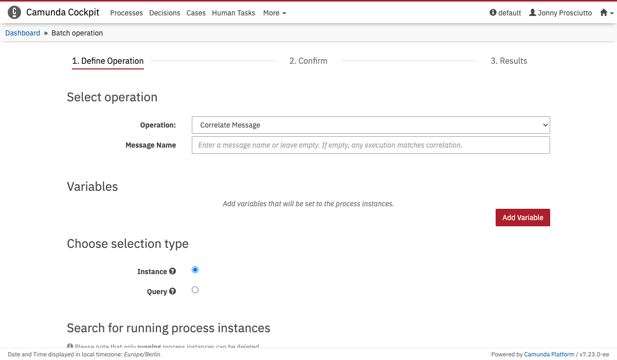 To proceed, click on the “Open Batch Operation” button. The correlate message batch operation page opens prefilled with the previously selected message name. Depending on whether you are on the process definition or instance page, a filter criterion defines the process definition or instance id.