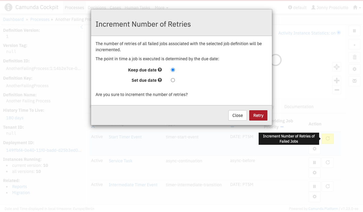 You can also perform a synchronous bulk retry of failed jobs. This feature is available in the process definition view in the Job Definitions tab. If you hit this button, you will increment the number of retries for all the defined jobs of the process definition.