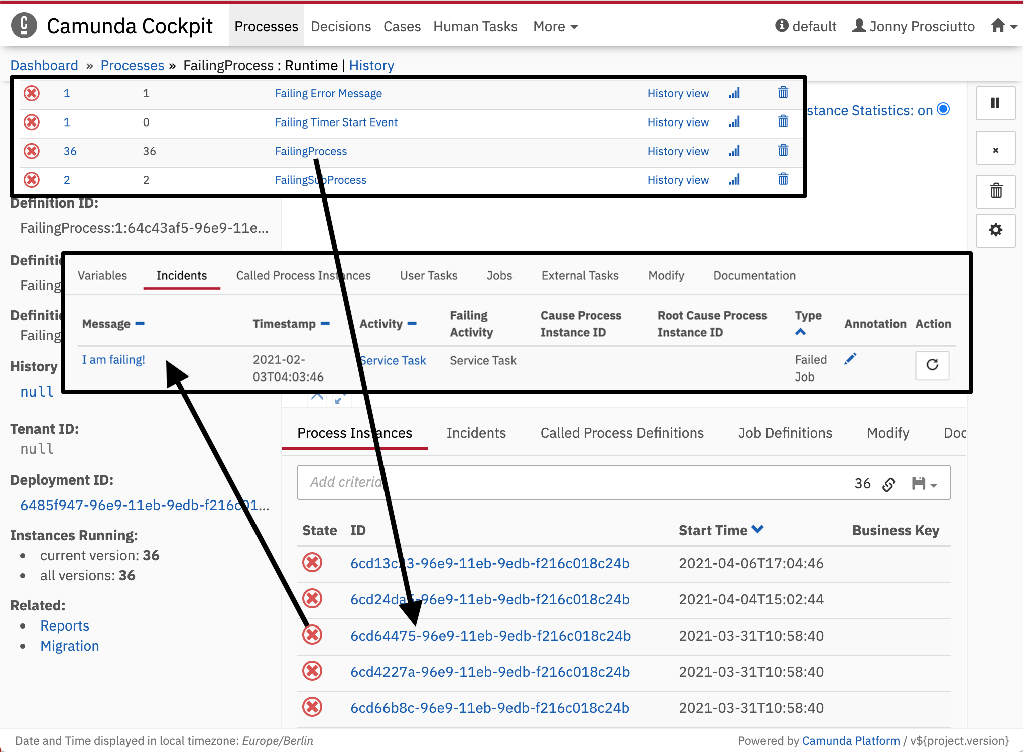Unresolved incidents of a process instance or a sub process instance are indicated by Cockpit as failed jobs. To localize which instance of a process failed, Cockpit allows you to drill down to the unresolved incident by using the process status dots. Hit a red status dot of the affected instance in the Process Definition View to get an overview of all incidents. The Incidents tab in the Detailed Information Panel lists the failed activities with additional information. Furthermore, you have the possibility of going down to the failing instance of a sub process.