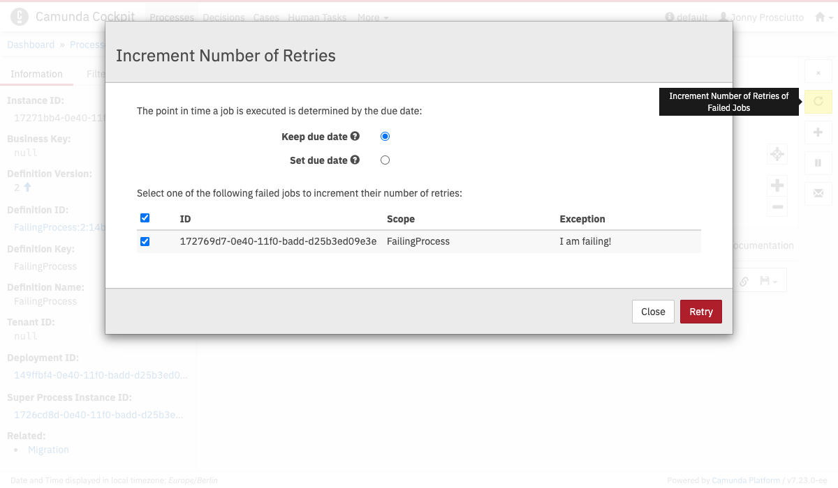 After clicking on Retry, the engine will re-trigger the jobs and increment their retry values in the database so the Job Executor can acquire and execute the jobs again.