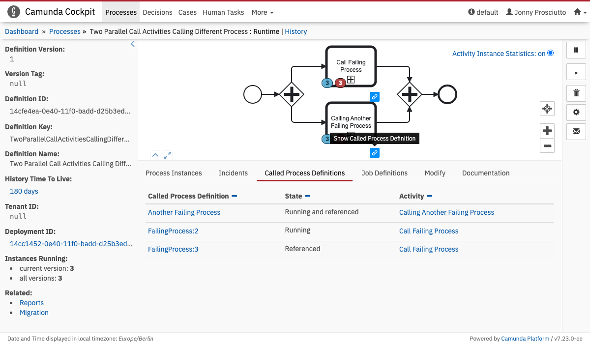 Additionally, you can use the called process definitions tab to get an overview of which call activity calls which process definition. We differentiate between three states: