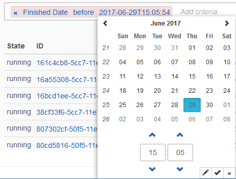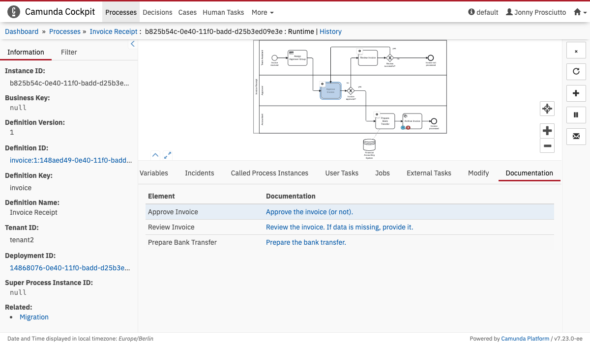 tab all running instances are listed in a tabular view. Besides information about start time, business key and state you can select an instance by ID and go down to the process instance view.
