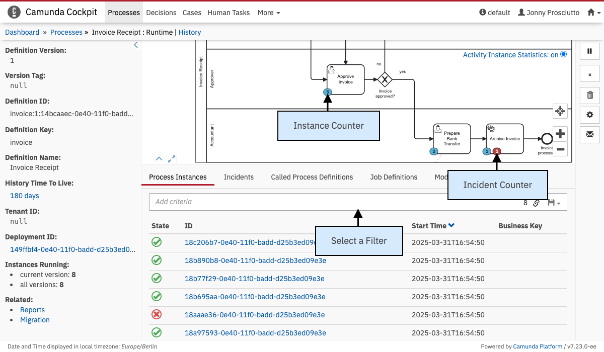 tab allows you to find certain instances by filtering for variables, business keys, activity IDs or date and time. In addition, you can filter for the process definition version by selecting the version of a process on the left side of the Process Definition View. Beyond that you can combine different filters as logical AND relation. Filter expressions on variables must be specified as variableName OPERATOR value