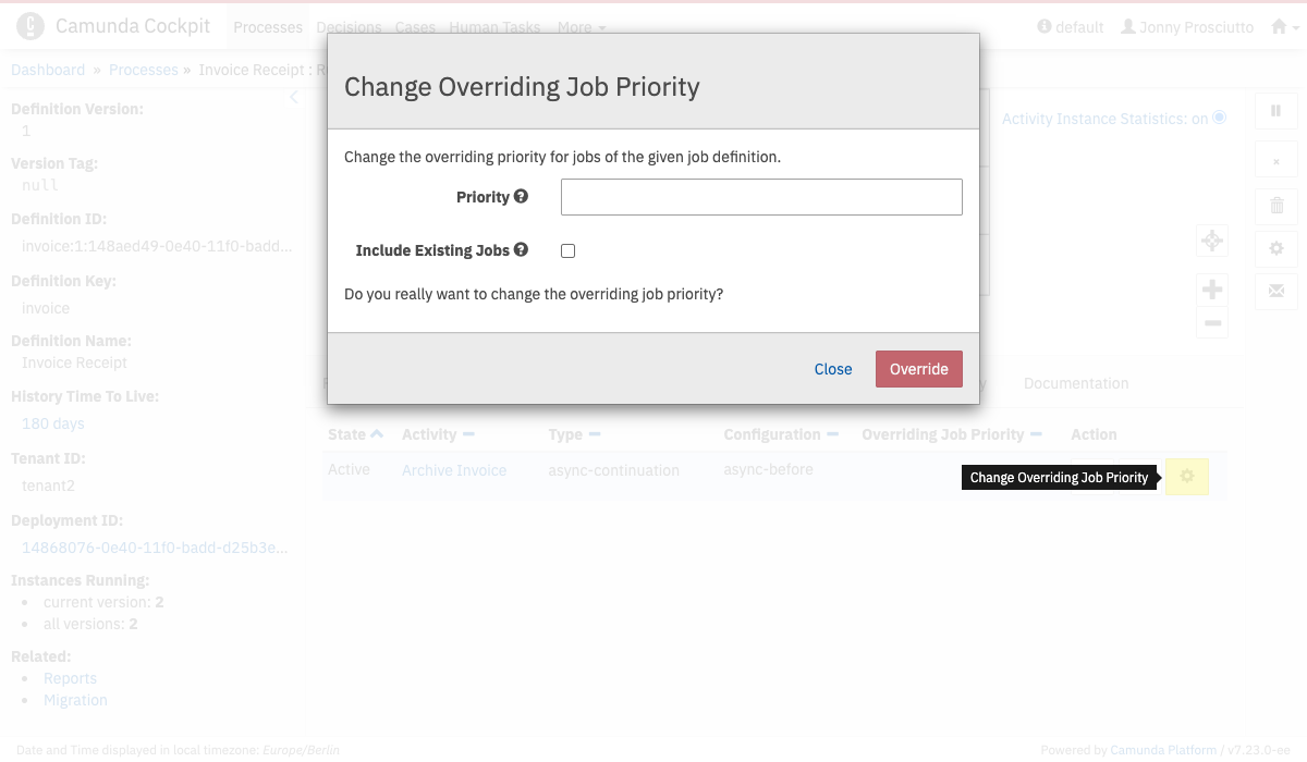 tab. In the opened dialog you can override the job priority. If an overridden priority is already set, you can clear it to use the priority specified in the XML again. It is also possible to include existing jobs when changing the priority.