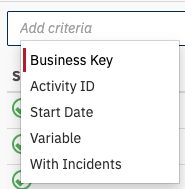Add a filter to the process definition view. Select a filter for variables, the start date and time, activity ID or the business key of process instances.