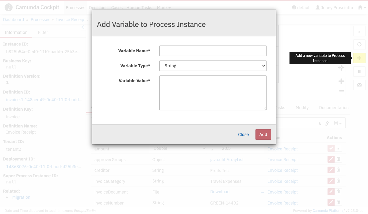 Hit the button on the right side to add variables to a process instance. You can choose between different data types. Please note that variables will be overwritten if you add a new variable with an existing name.