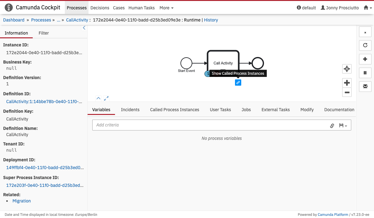 Use the detailed information panel to get an overview of the variables, incidents, called process instances, user tasks and external tasks that the process instance contains. Furthermore, you can access the instance modification tab. Depending on the selected activity instance in the rendered diagram, the panel lists the corresponding information. You can also focus on the activity instance via a scope link in the table.
