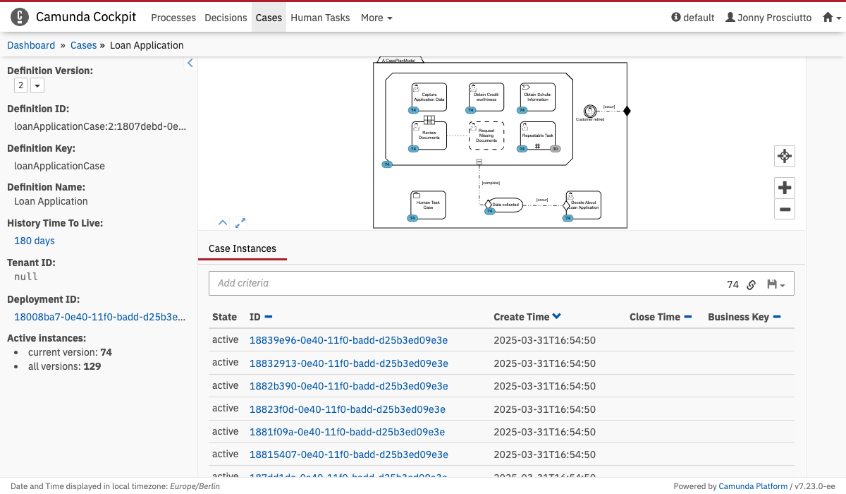 The case definition view also provides you with information about the definition and the status of a case. On the left side you can easily survey the versions of the case and how many instances of the versions are active. The version of the case definition can be changed in the dropdown menu. The diagram is then updated accordingly. Clicking on the deployment ID will take you to the deployment view.