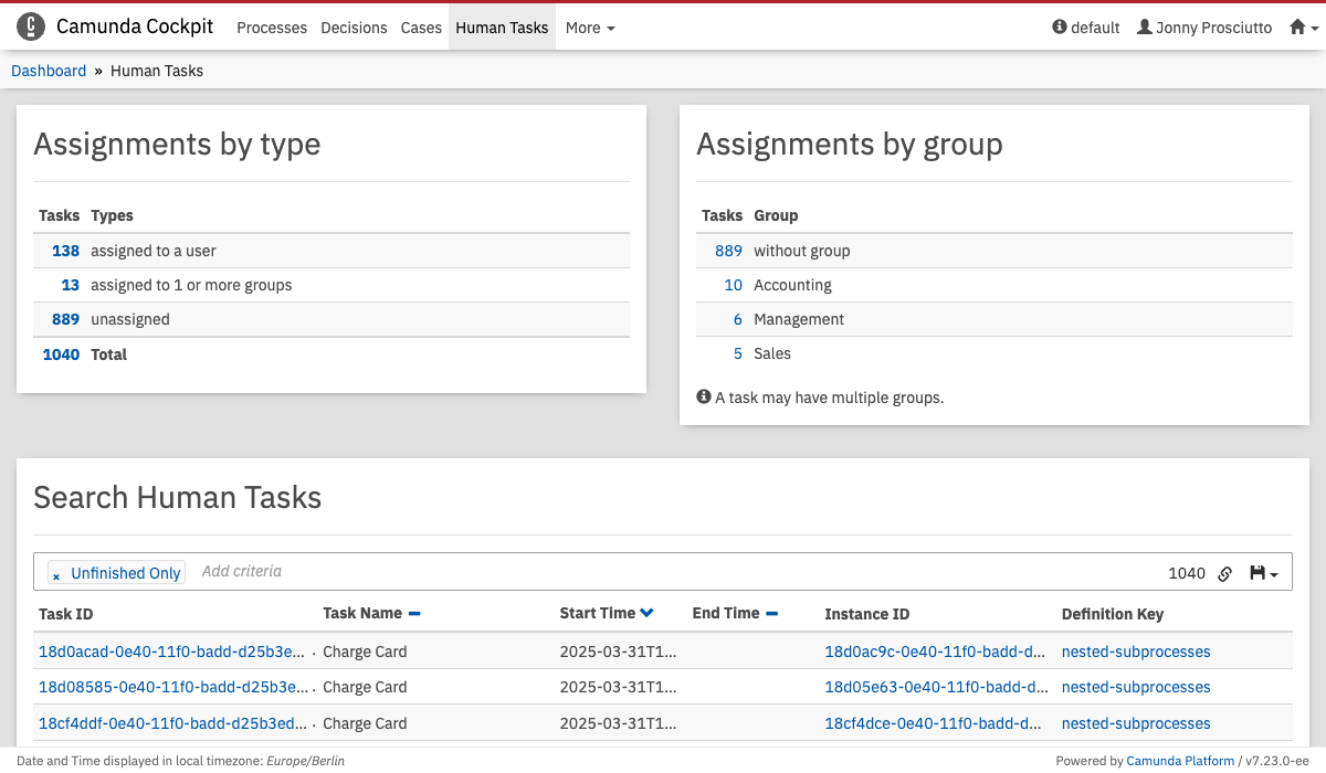 You can use the open tasks dashboard to see how the open tasks are distributed by individual factors. Refer to the Cockpit Plugins section for information about adding a custom open task dashboard plugin.