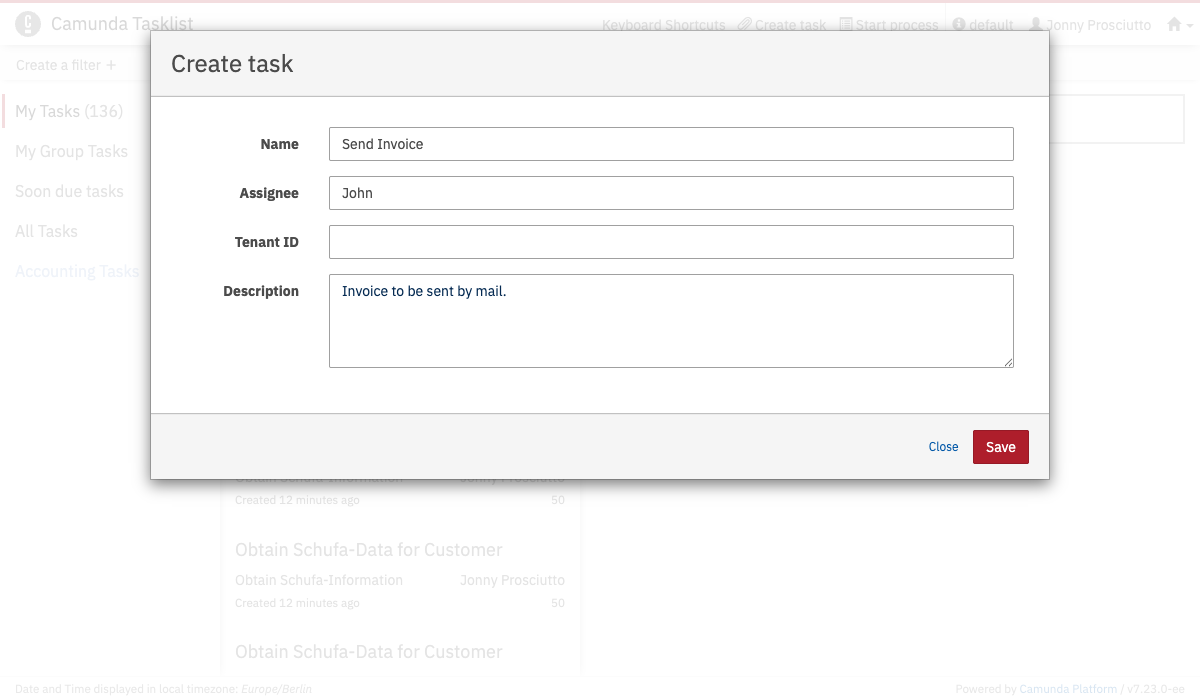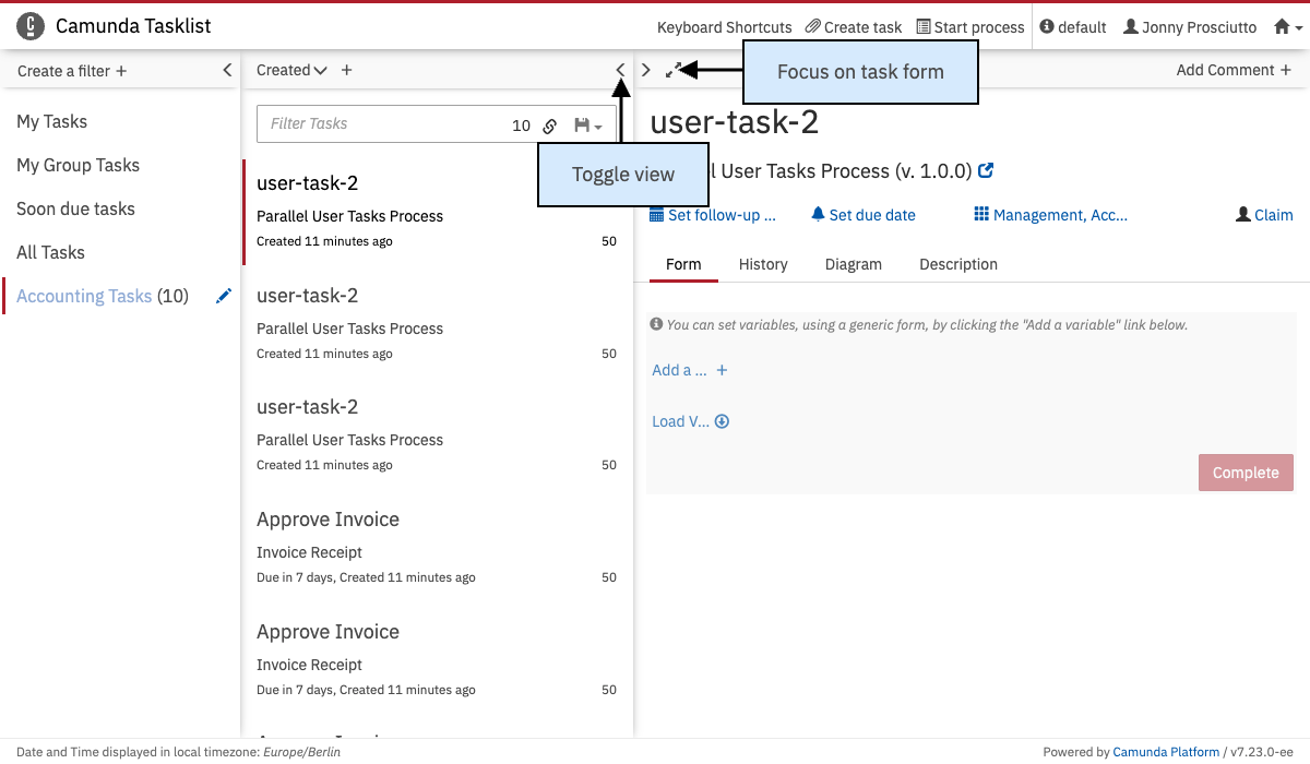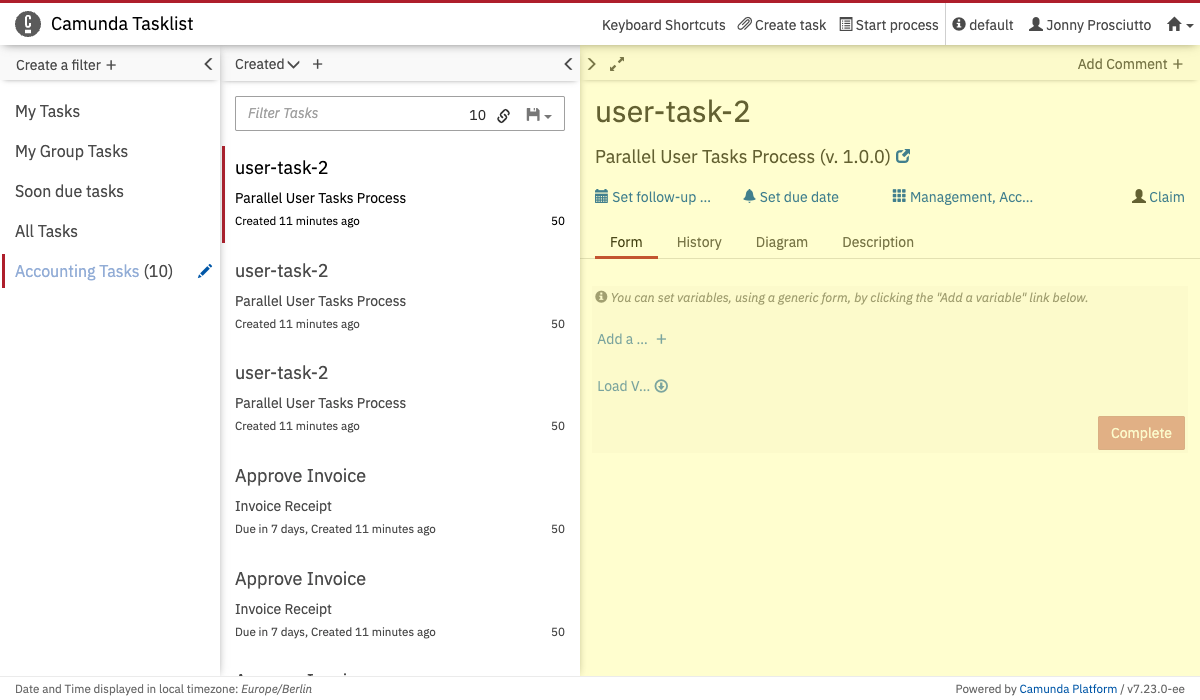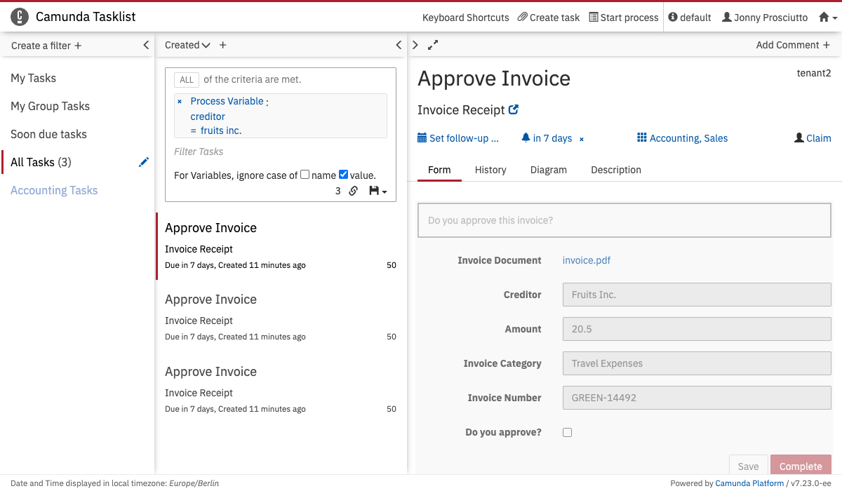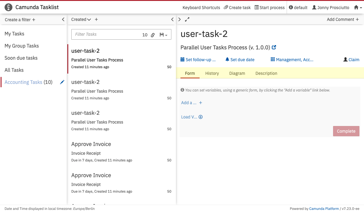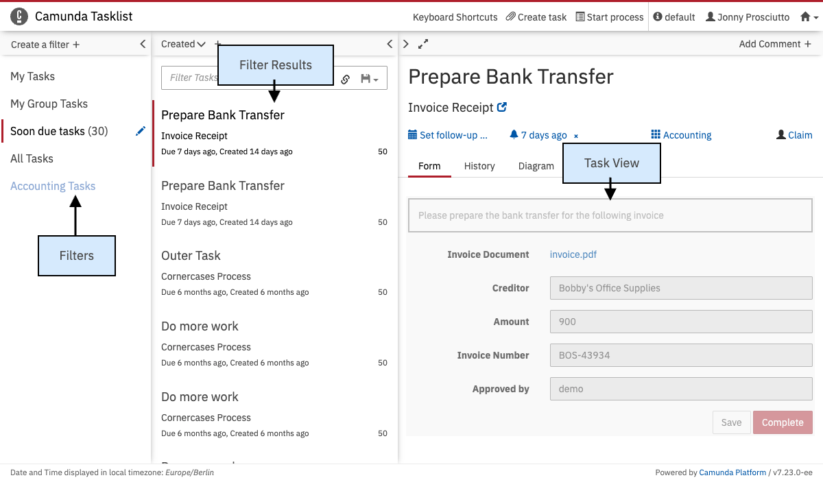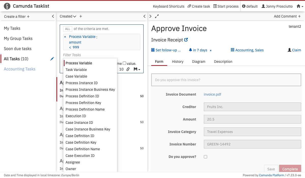 On the dashboard of Tasklist you see an overview of pending tasks. On the left side of the screen, an overview of the filters is displayed. On the upper right side of the screen, you can set a follow-up or due date, you can claim, unclaim and reassign tasks and you can add comments. Underneath that section, the embedded form is displayed (please note that external task forms cannot be displayed here), you can switch to the task history, you can see the diagram view or you can view the description of the user task.