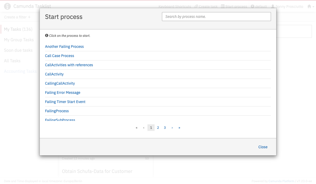 To start a process instance via Tasklist, click on Start process in the header menu and select a process out of the displayed list of process definitions. If no process definitions are listed here, please verify that your process application is deployed correctly.